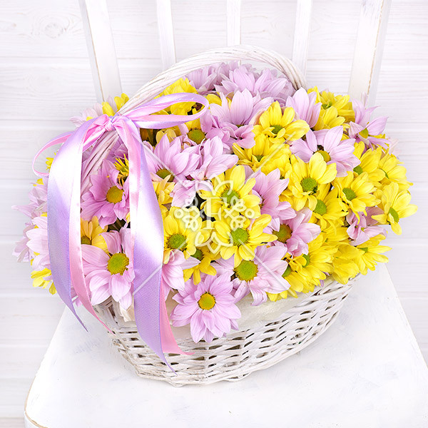 Хризантемы желтого и розового оттенков, уютно разместившись в плетеной корзинке, выглядят нежно и привлекательно!